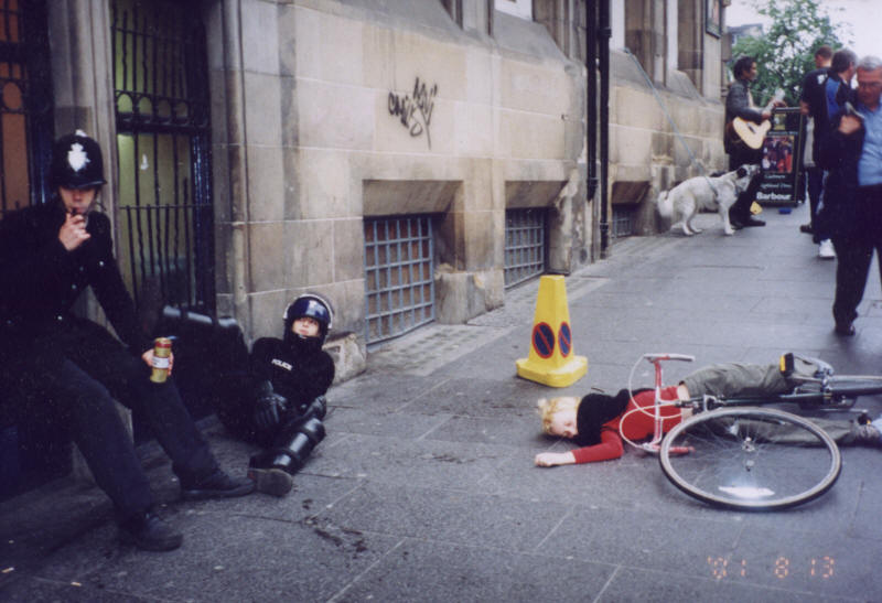 Tragggedia in strada. Ragazza su bicicletta (in basso a sinistra), inseguita ed uccisa da poliziotti ubriachi (in alto a destra), che tentavano di far abbaiare un cane al guinzaglio (in alto a sinistra). Il cane, dapprima rabbioso (in basso a destra), aveva appena morsicato un marziano vestito da chitarrista (in centro). |