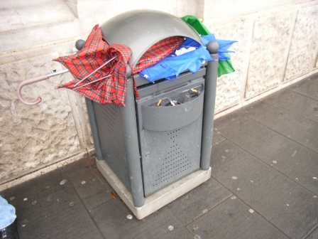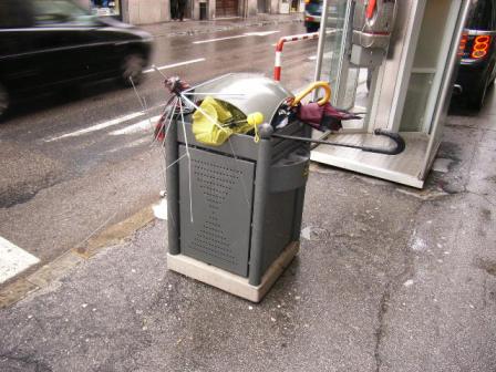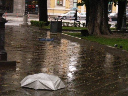 Eh, proprio no. Non è il traffico. Neanche la siccità. Il problema di trieste è la moria degli ombrelli. I triestini sembrano insensibili a questi piccoli esseri colorati come delle farfalle, che ti proteggono dalle intemperie e sì, dal vento e dall'acqua. Eppure gli abitanti di questa città sembrano inerti a tali creature. Creature che anche se non parlano, non ascoltano, non vedono e non sentono hanno un'anima anche loro. Un'anima pura, lucente, metallica, direi in acciaio inox. Eppure, anche se proteggono i triestini, ma anche tutti i popoli di questa terra, vengono bistrattati, buttati a terra, ingiuriati ad ogni occasione, così ormai si stanno estinguendo in questa città borica. Per questo chiedo, attraverso una telethon che è partita dal due giugno 2006, un contributo a tuttti. Uno sforzo, una mano sulla coscienza (ed una sul portafogli), per evitare la tragedia. Per questo chiedo di donarmi i vostri soldi per il progetto "umbrella nel cuore" Date il vostro contributo. Io costruirò un bel negozio di ombrelli e qui a trieste farò soldi a palate. Ciao. |